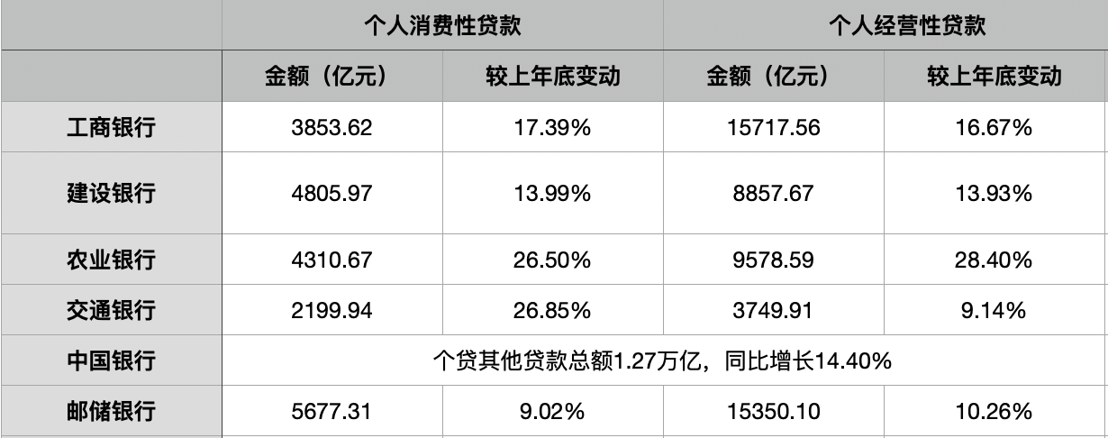 而緊隨其后的工行、建行同樣在消費貸和經(jīng)營貸兩項業(yè)務(wù)上實現(xiàn)了兩位數(shù)以上的漲幅。
