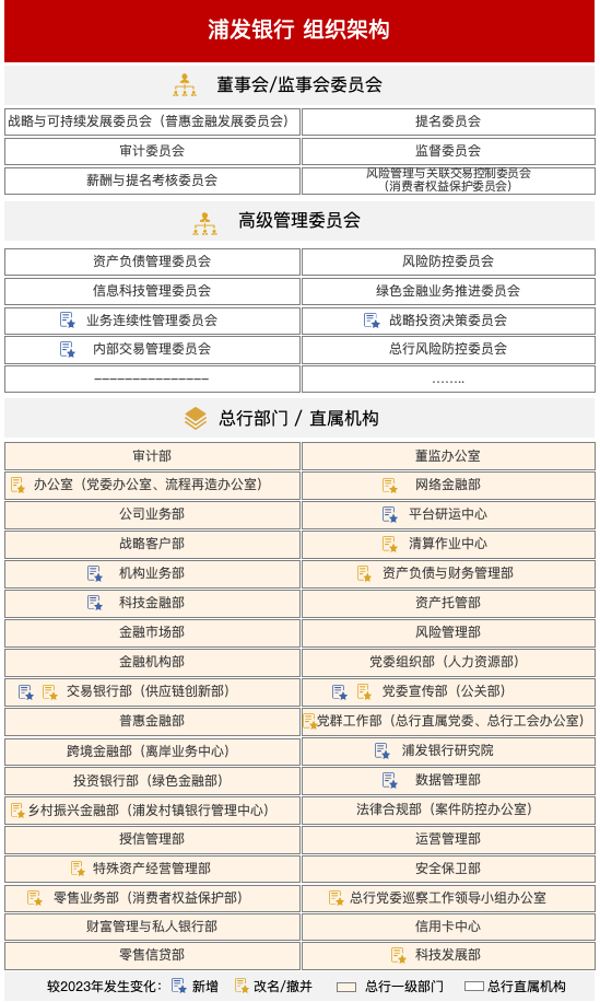 與2023年比,浦發(fā)銀行組織架構(gòu)變動較多,詳細(xì)如下: