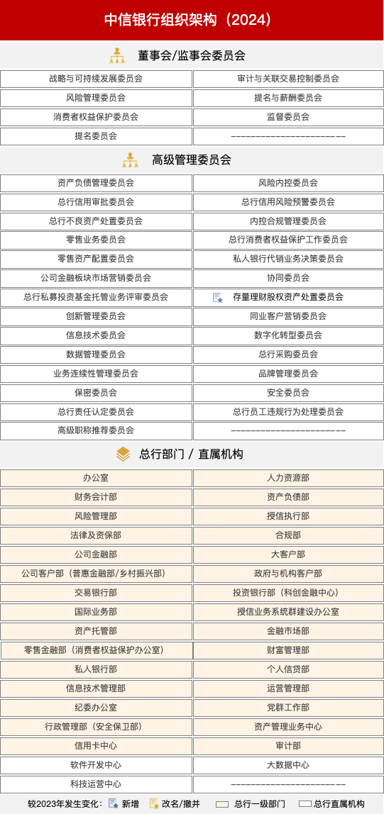 與2023年比,中信銀行組織架構變動如下: