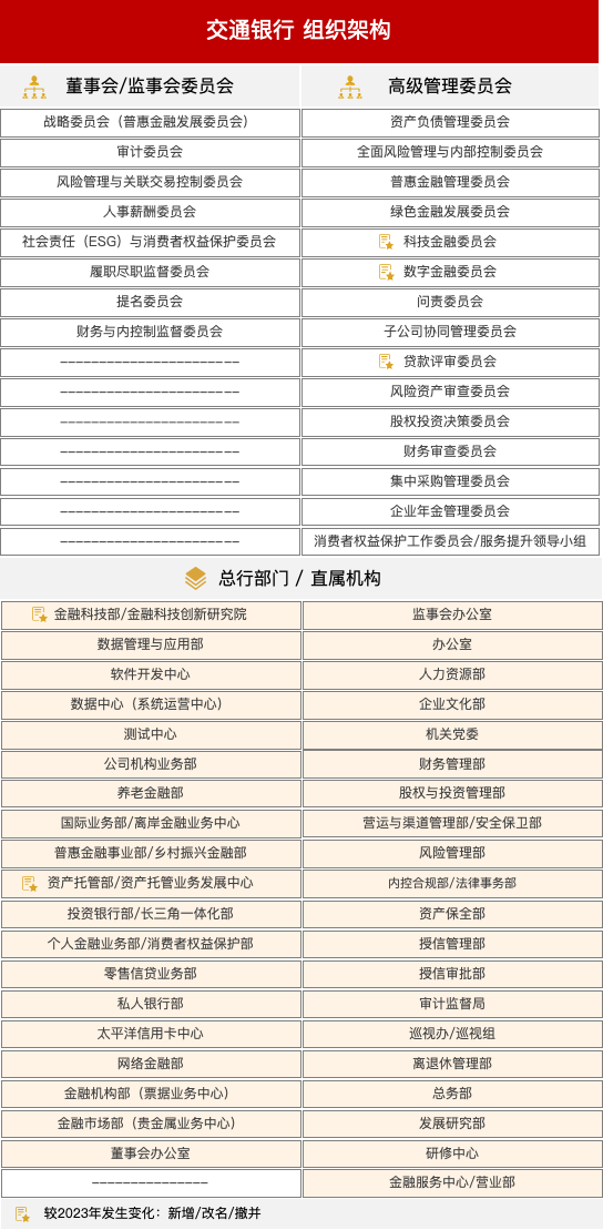 與2023年披露的信息相比,交通銀行組織架構(gòu)調(diào)整如下。