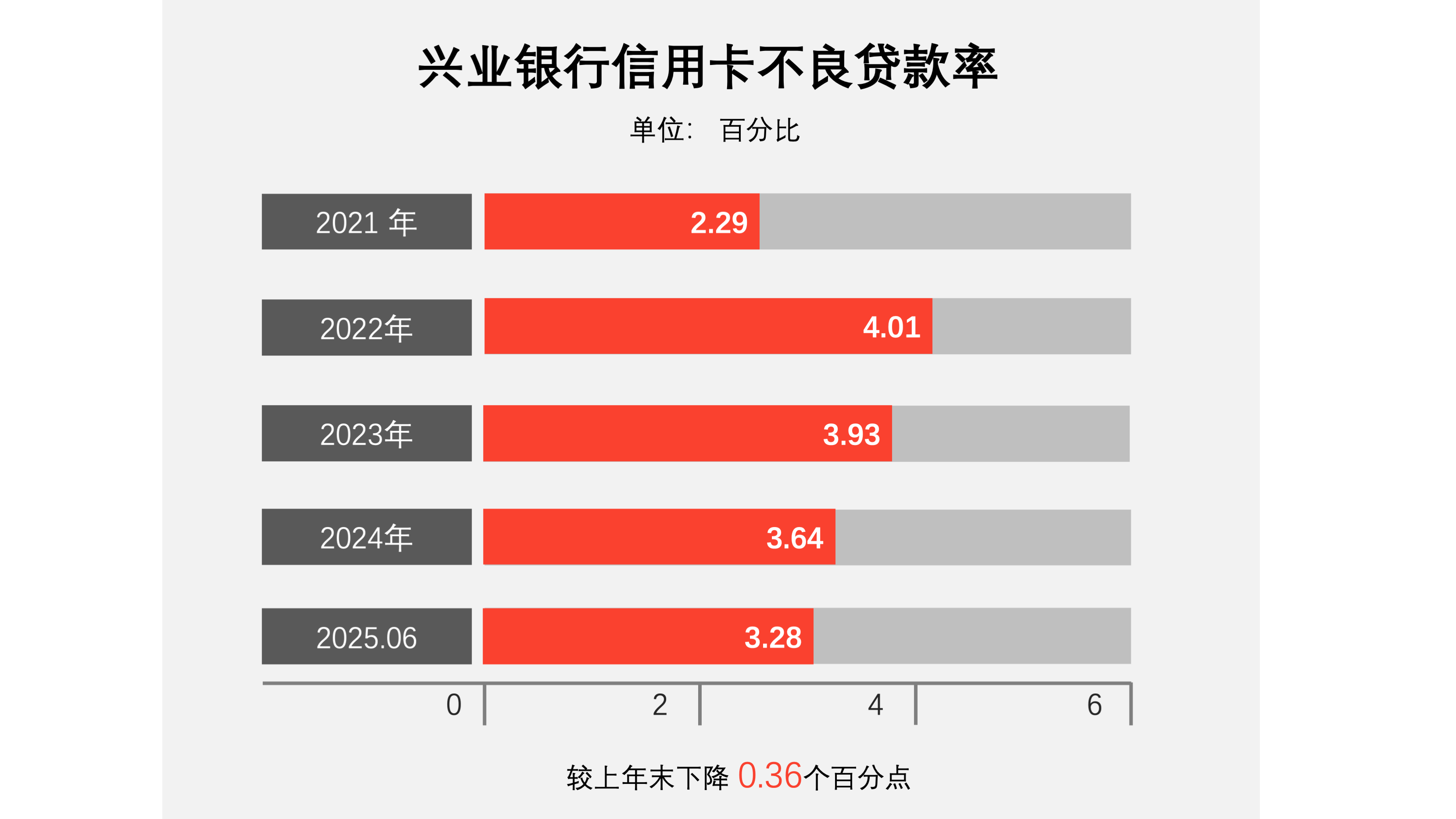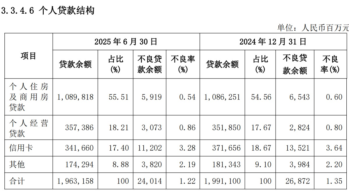 截至報告期末,信用卡不良貸款率3.28%,較上年末下降0.36個百分點。