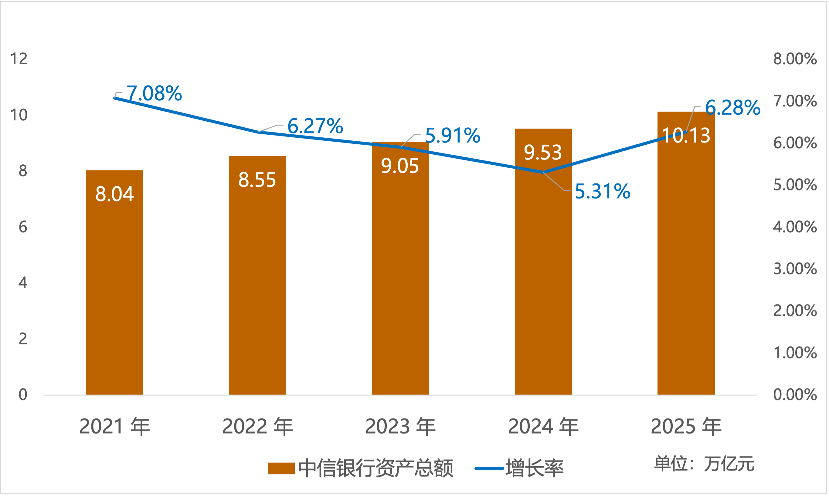 截至報告期末,中信銀行資產總額101,316.58億元,比上年末增長6.28%,再次壯大“十萬億隊伍”;除國有大行以外,目前資產總額突破十萬億元的股份制銀行的有招商、興業、浦發和中信四家。中信銀行資產總額以穩提質,一步一個臺階,逐年持續穩健增長。