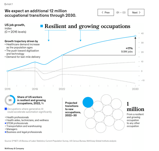 據統計在2019—2022年,美國大約有860萬人的職業發生了轉變,現在這一趨勢將繼續發展下去。麥肯錫估計,到2030年,美國將有1200萬人發生職業轉變。