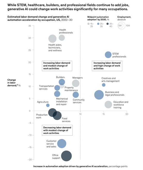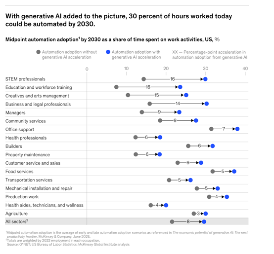 由于生成式AI的出現加速了企業對自動化的應用進程,麥肯錫估計,到2030年,自動化會接管美國30%的經濟工作時間。