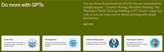 OpenAI推出了自定義GPT版本,可以幫助金融、醫(yī)療、法律、教育、日常工作、幼兒教育等任何行業(yè),例如,讓ChatGPT教孩子如何學(xué)習(xí)3年級(jí)寫作;讓ChatGPT回答特定的技術(shù)內(nèi)容等,打造獨(dú)屬自己的ChatGPT。