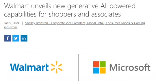 1月10日,微軟在官網(wǎng)宣布與全球最大超市沃爾瑪,達成生成式AI技術合作。