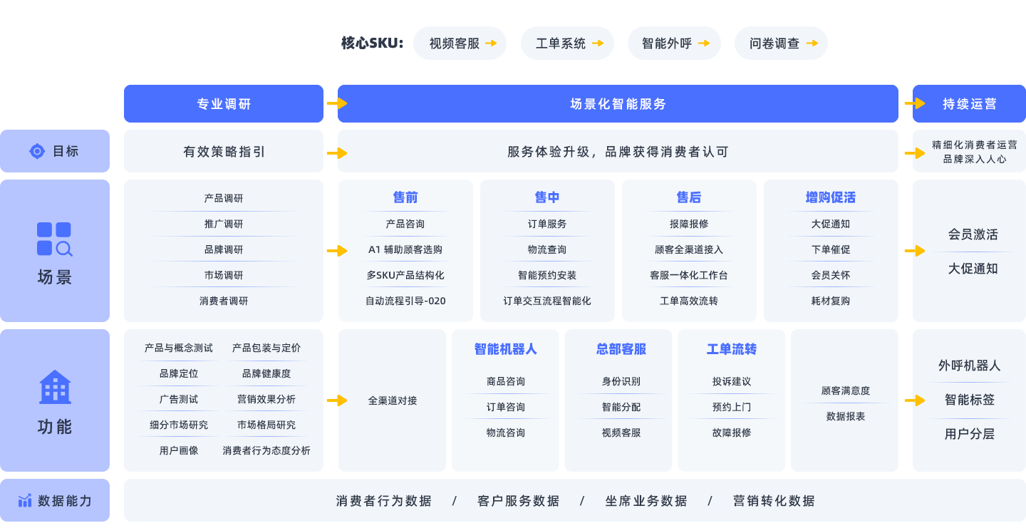 具體涵蓋購前行為數據洞察與需求建模,優化商品發現路徑與導購體驗;購中實時場景感知與精準服務觸達機制,提升咨詢轉化效率;購后搭建智能化自助服務體系,實現售后流程自動化與服務效能提升